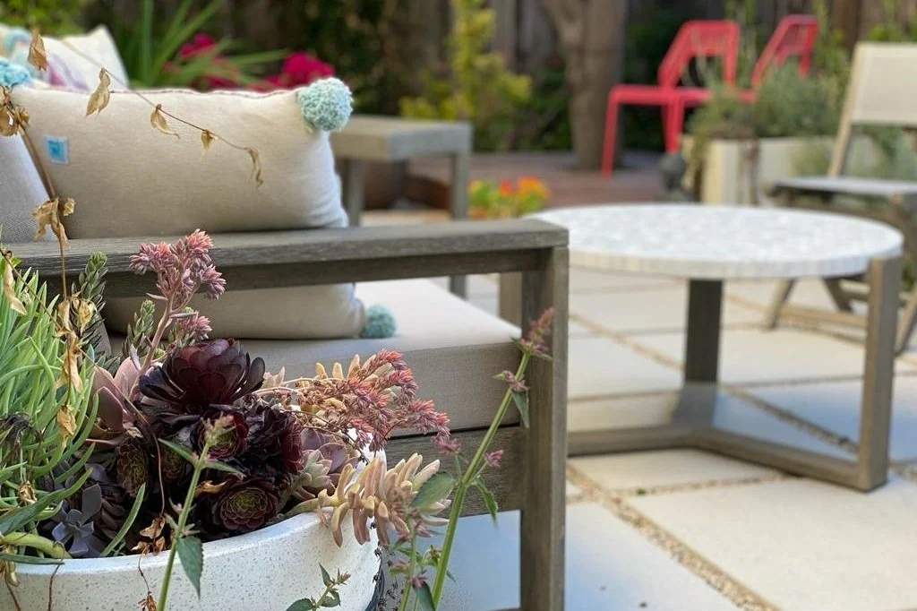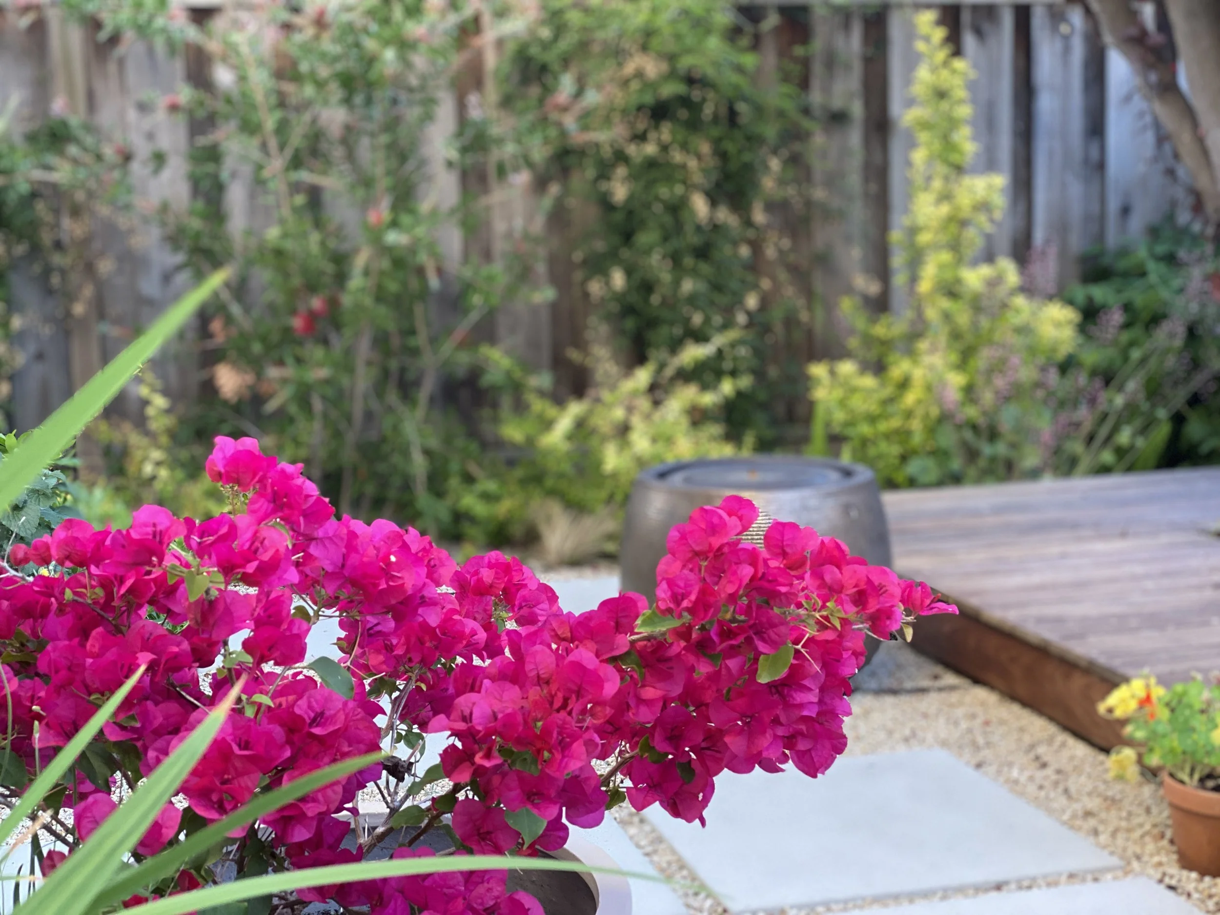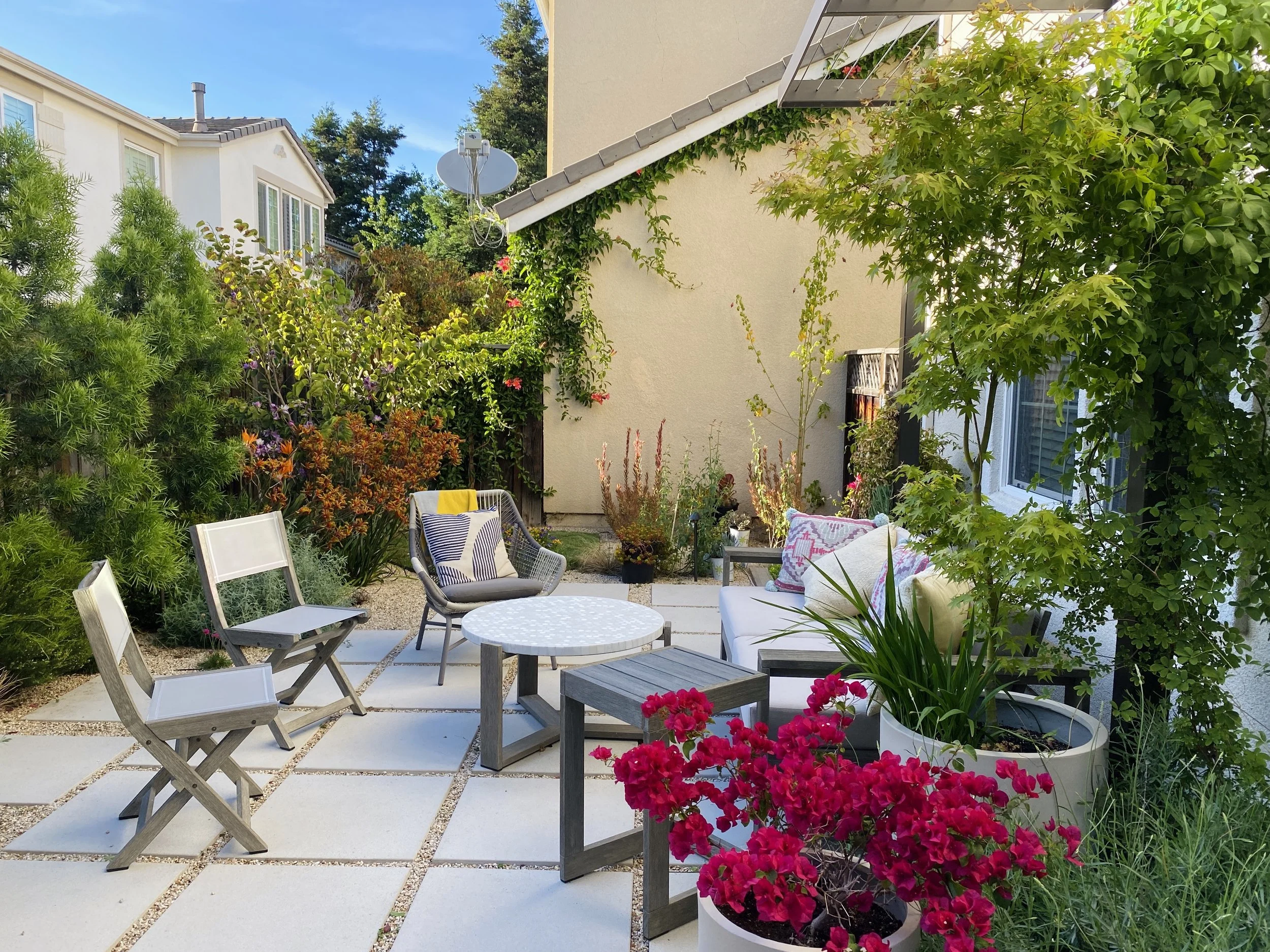 With a concrete pad right outside the door, disparate planting set against the walls, and patchy grass covering the rest of the space, this client’s backyard in Dublin, California was a tad uninviting. We decided to use light colored hardscaping materials – contemporary concrete pavers and light gravel to make the space brighter. We also moved the main lounging area further into the center of the garden to encourage movement through it. A wooden deck was designed around the existing cherry blossom tree to hide and protect the roots as well as to create a cozy conversation spot. Plants at the threshold and the view of the beautiful tree beyond now draw people outside. A small water fountain adds to the garden soundscape and is a magnet for hummingbirds. Layers of plantings including tall screening trees that provide a sense of privacy and water-wise native flowering plants create a lush and intimate environment.
