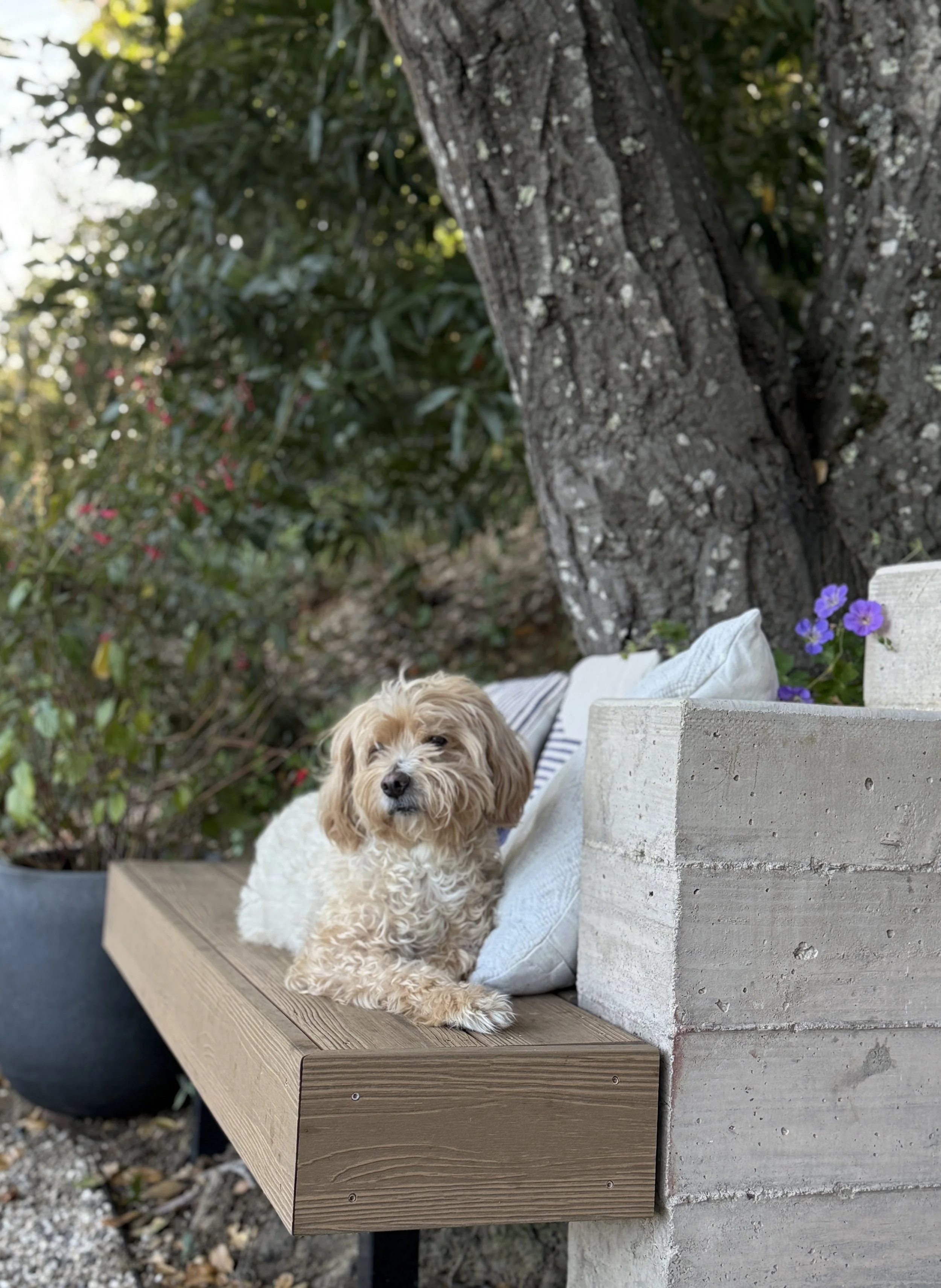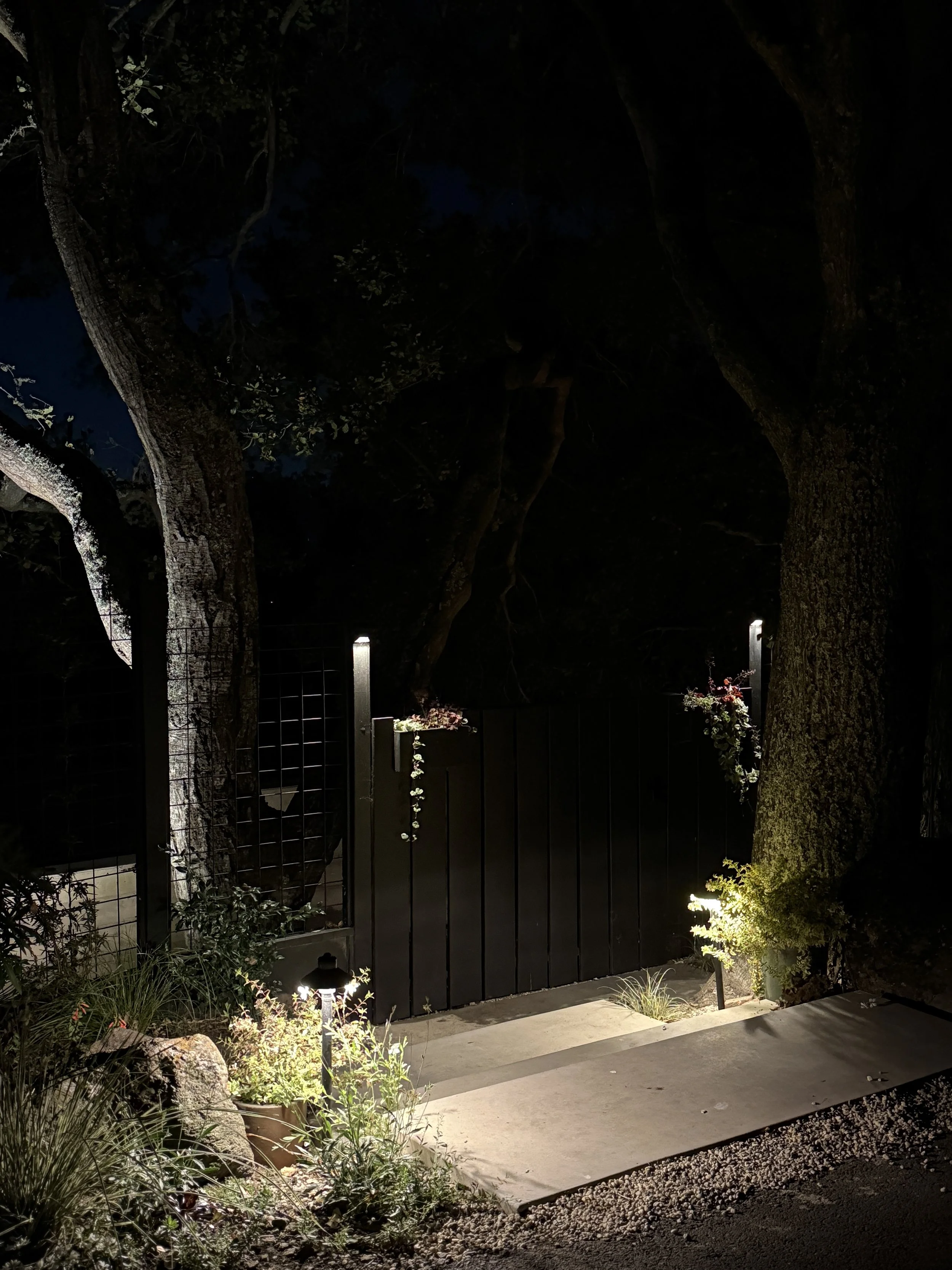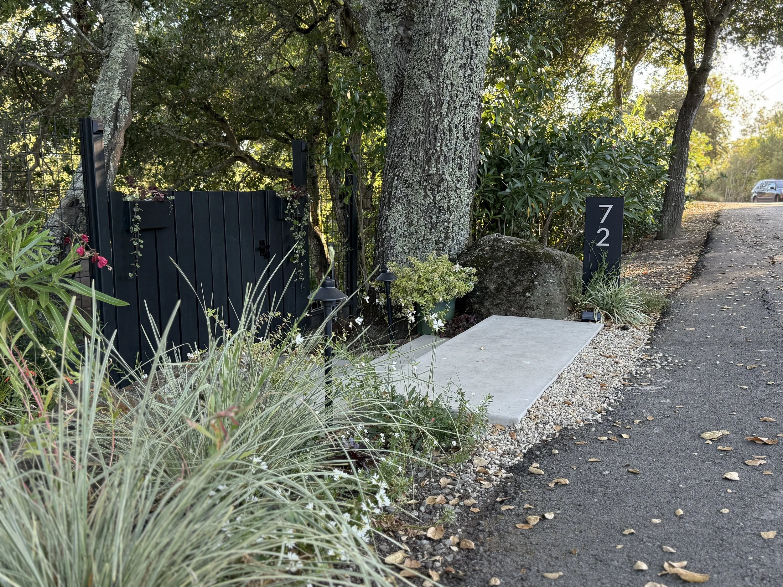 Our clients loved the laid-back nature of their new front yard, with the mature live oaks providing a sheltered haven for birds and critters but wanted to update it to create a more inviting entry and robust retaining structure for the steep slope. We designed the stairway to naturally slow down the pace of movement through it; to have an easy, open feel with strategic places to stop and enjoy the space.