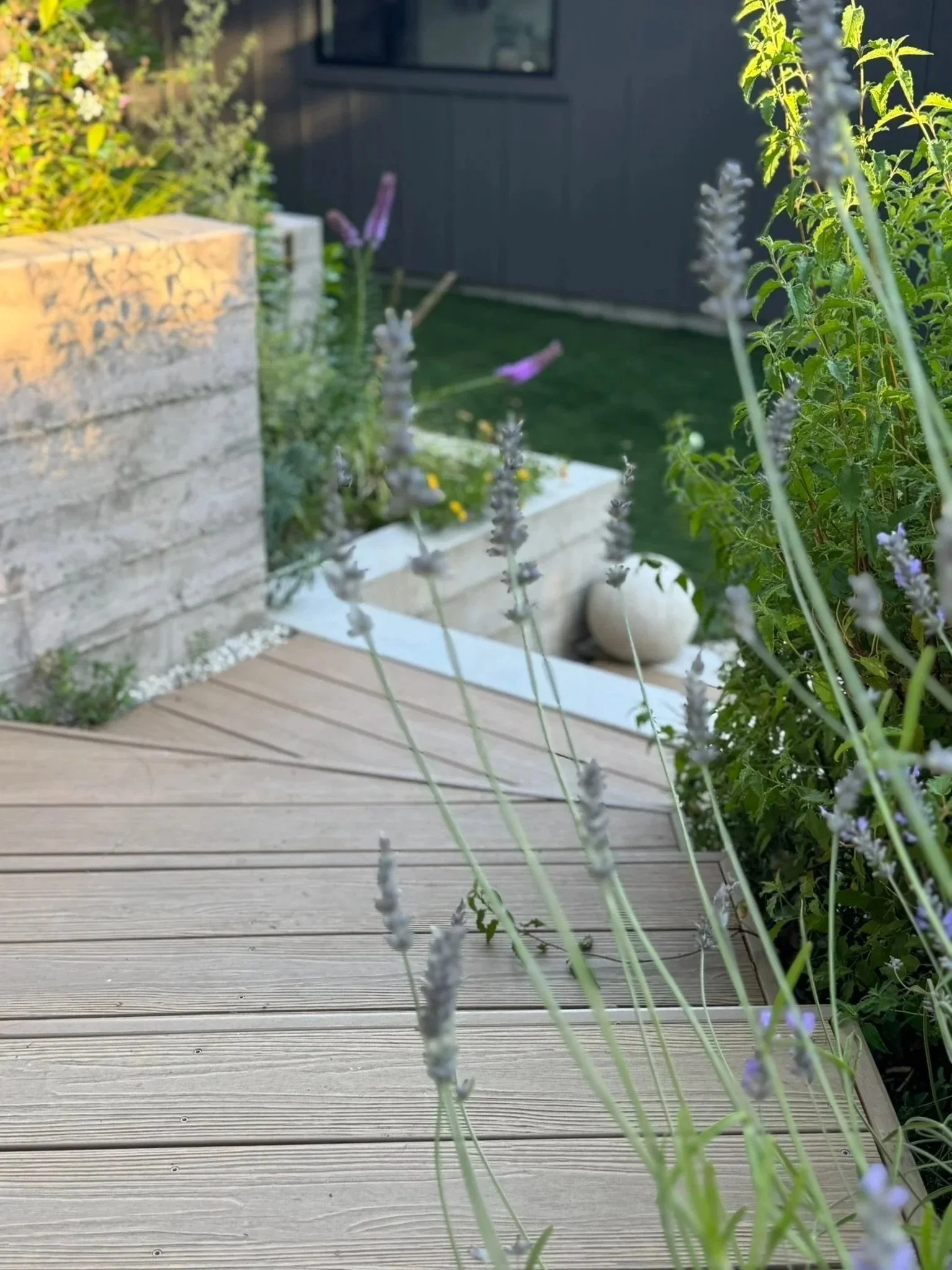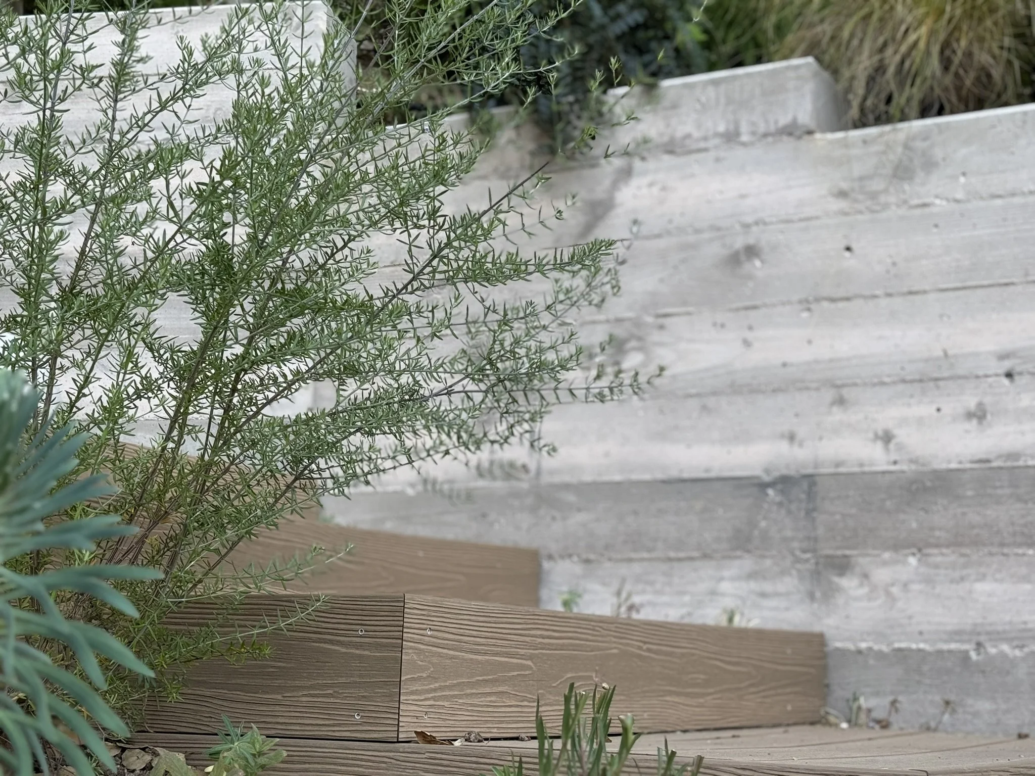 A bamboo composite with recycled content was used for the stairs to reduce maintenance – a client priority. The composite, along with the board-form concrete of the retaining walls, makes for interesting yet mellow hardscaping that blends with the natural surroundings.