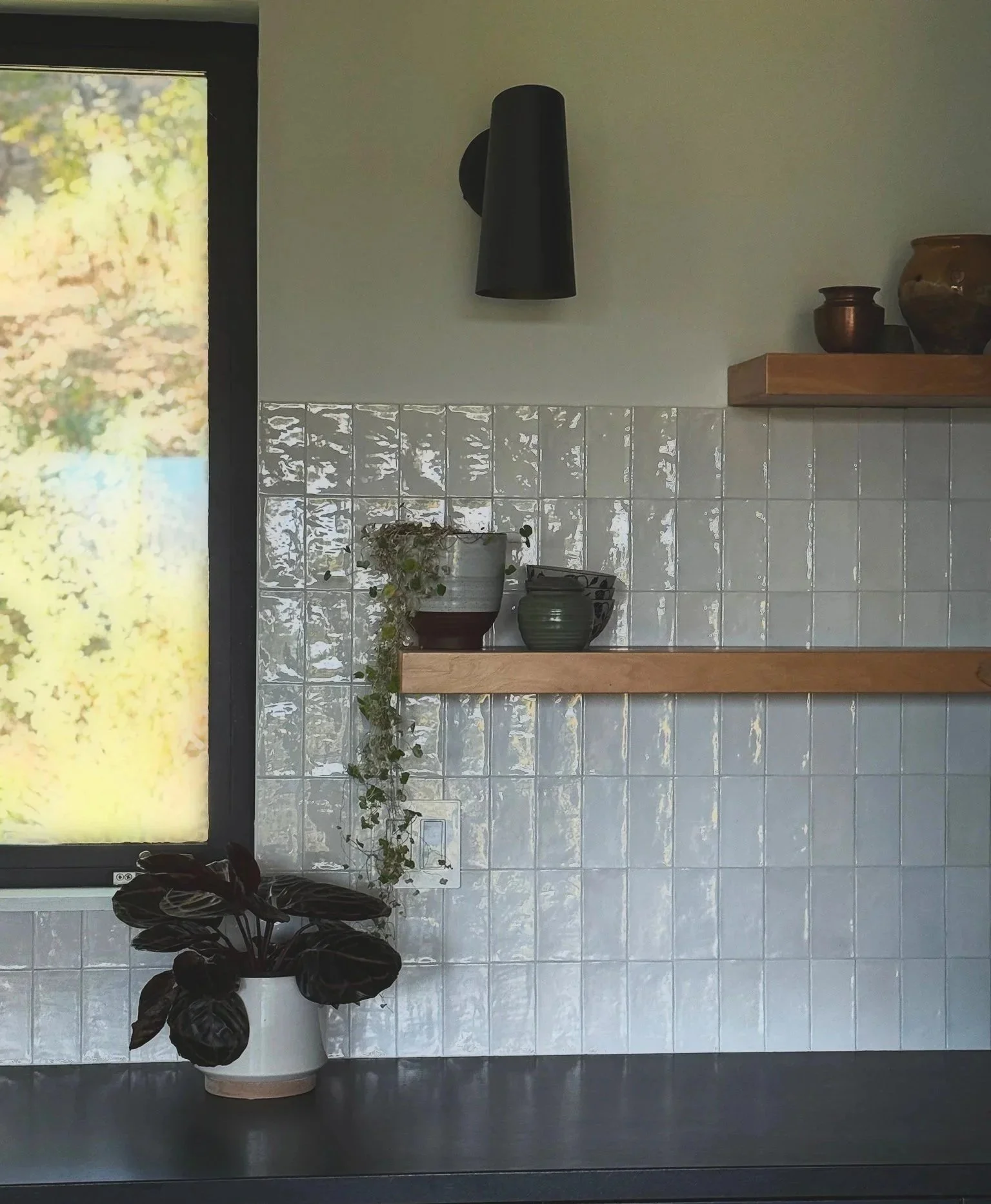 We chose white zellige-style glazed ceramic tiles that sparkle and bounce light around beautifully. The light-oak floating shelves have the clean lines that the clients prefer while still adding warmth.