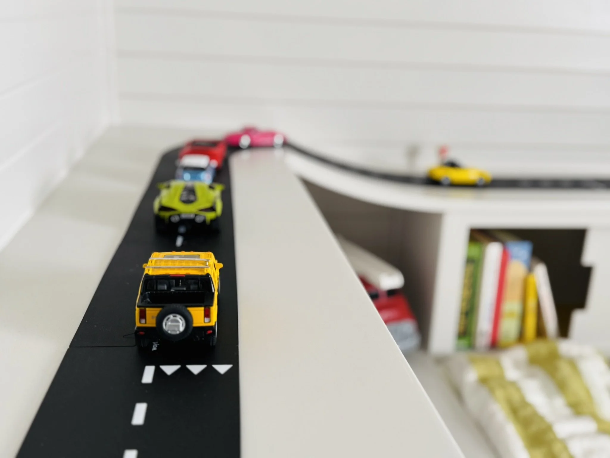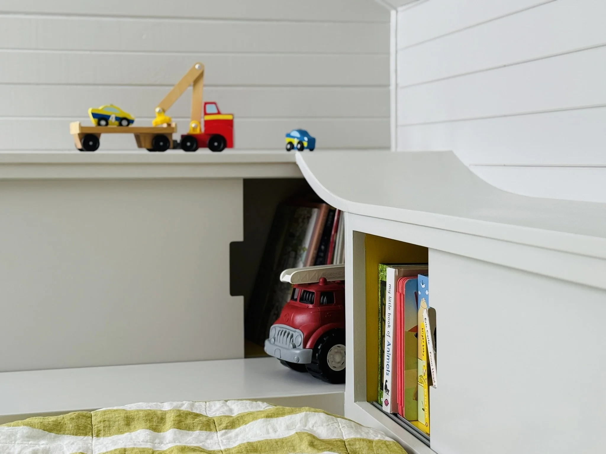 The custom bed with built-in storage has plenty of space for books and stuffies and also a continuous surface where legendary races happen!