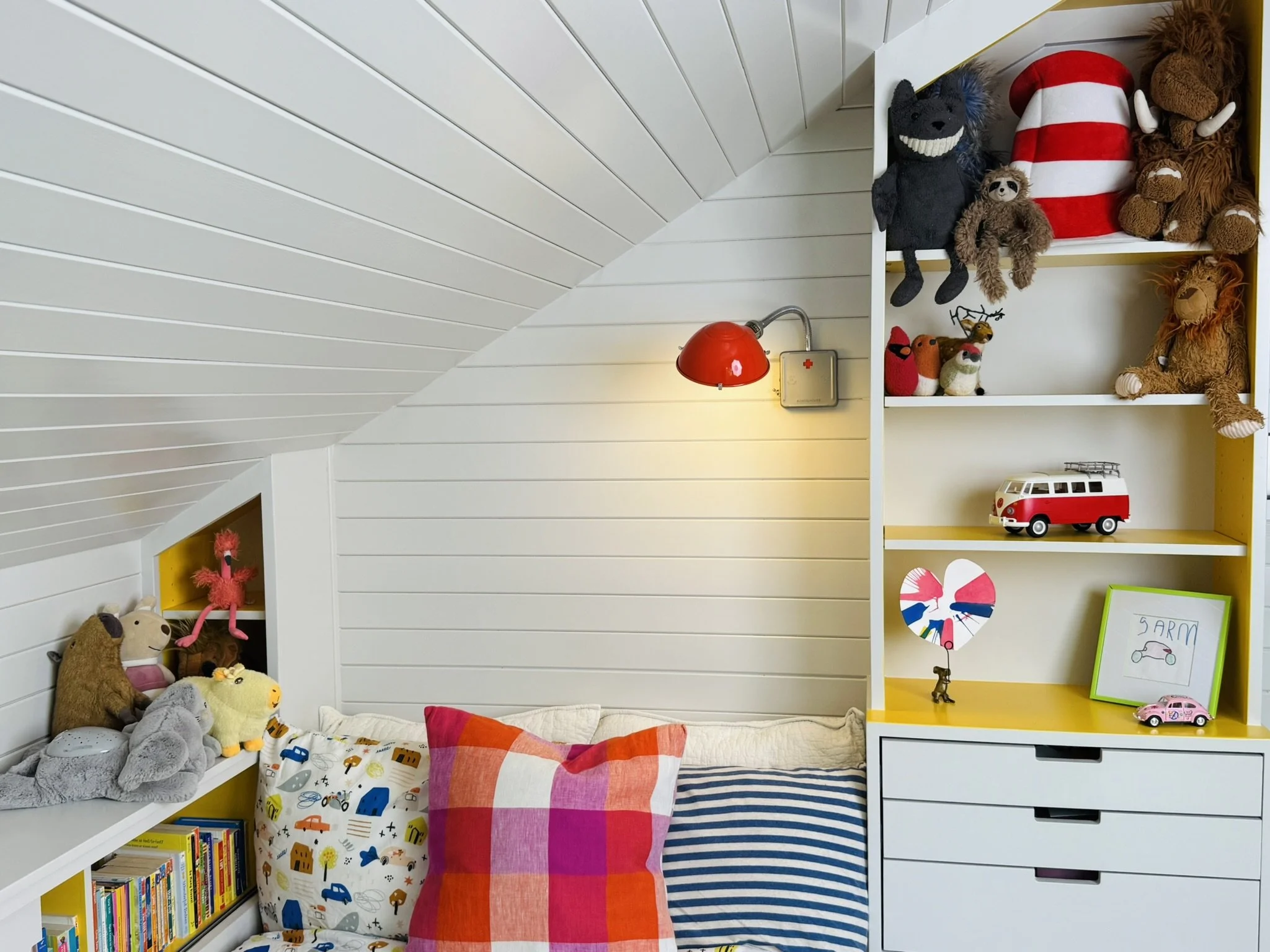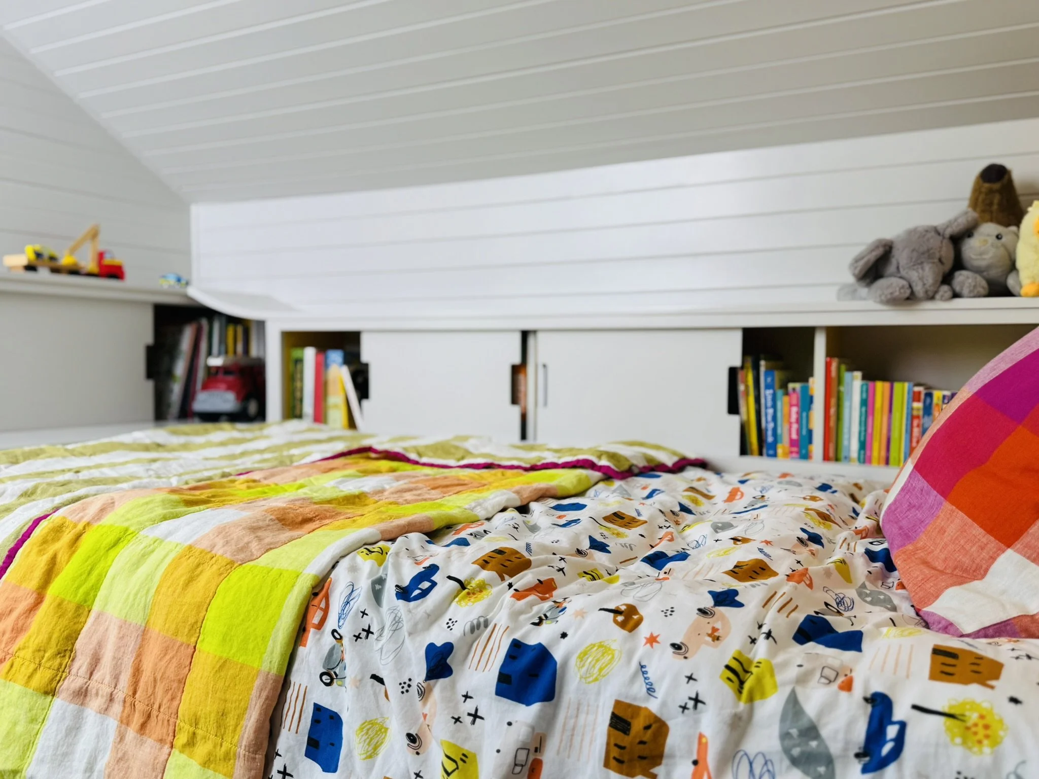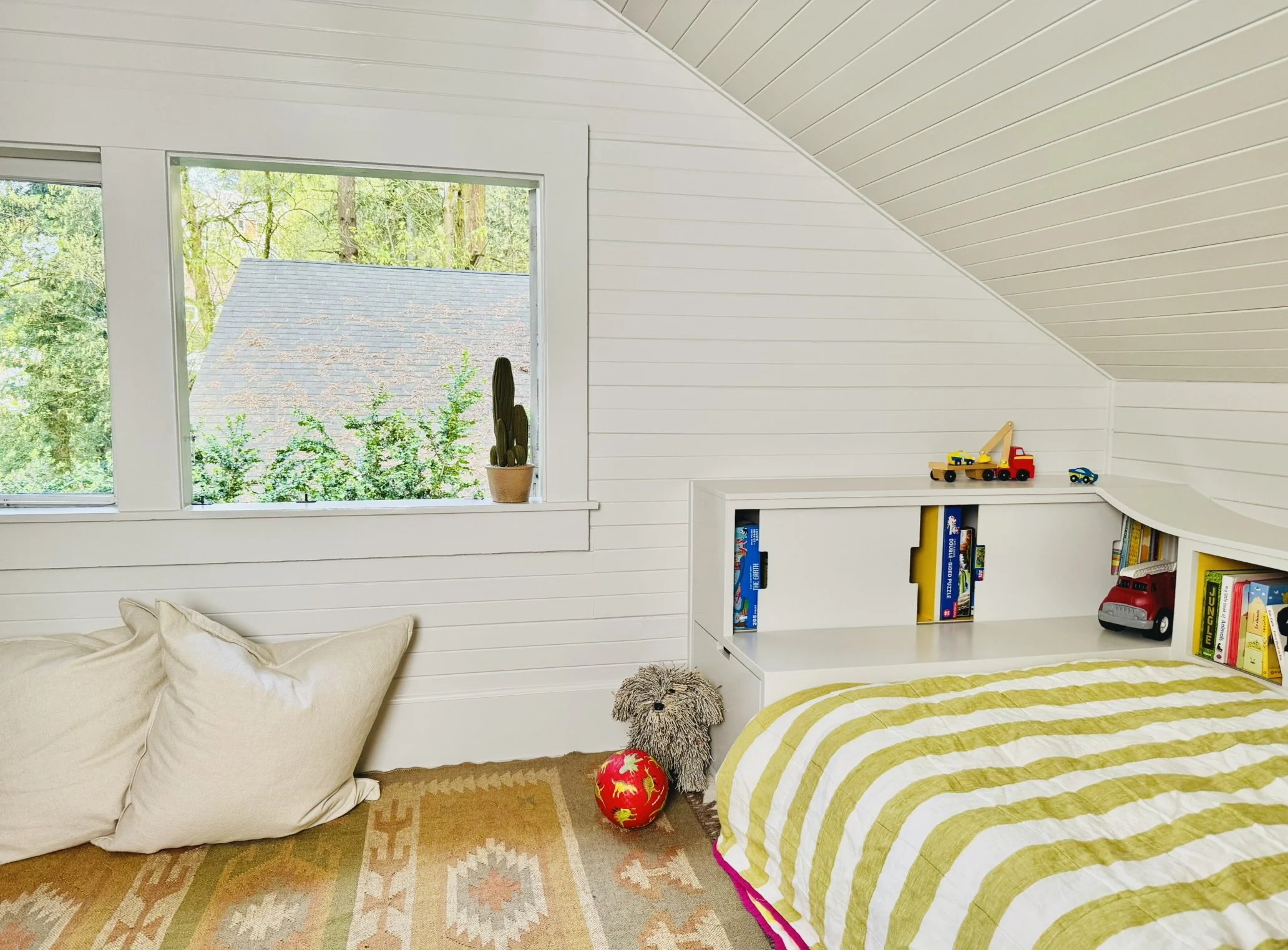 The sloped ceiling and limited space informed our approach - we designed the bed on one side of the room with storage where the ceiling is the lowest, leaving floor space for play.