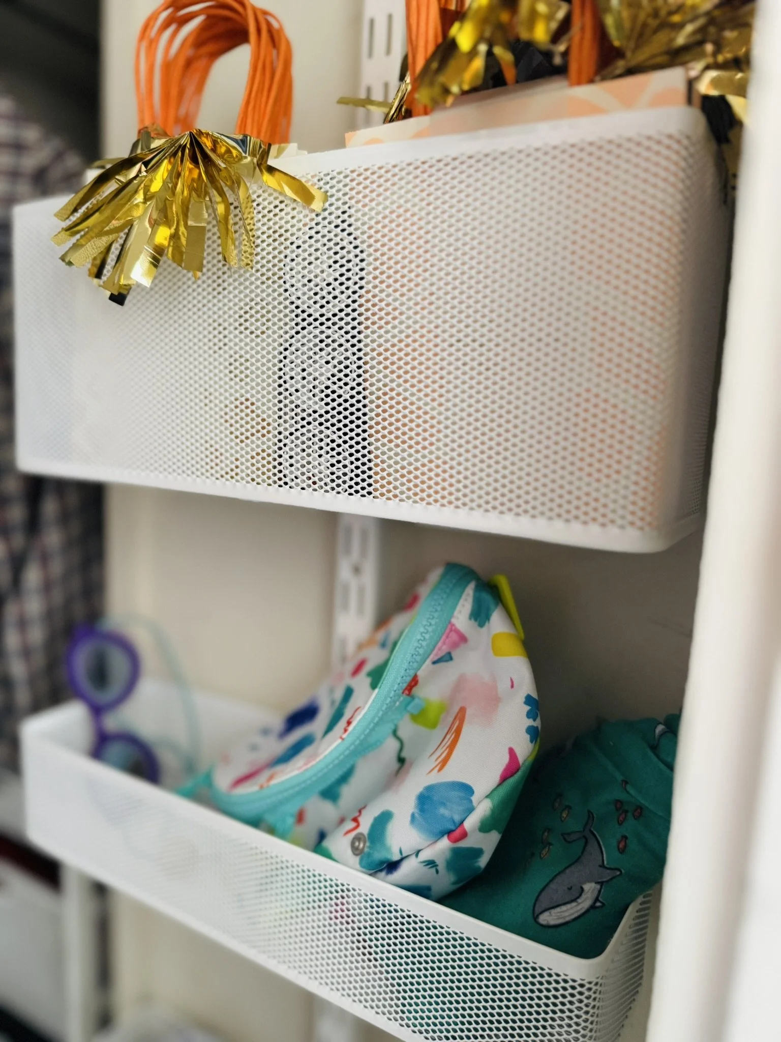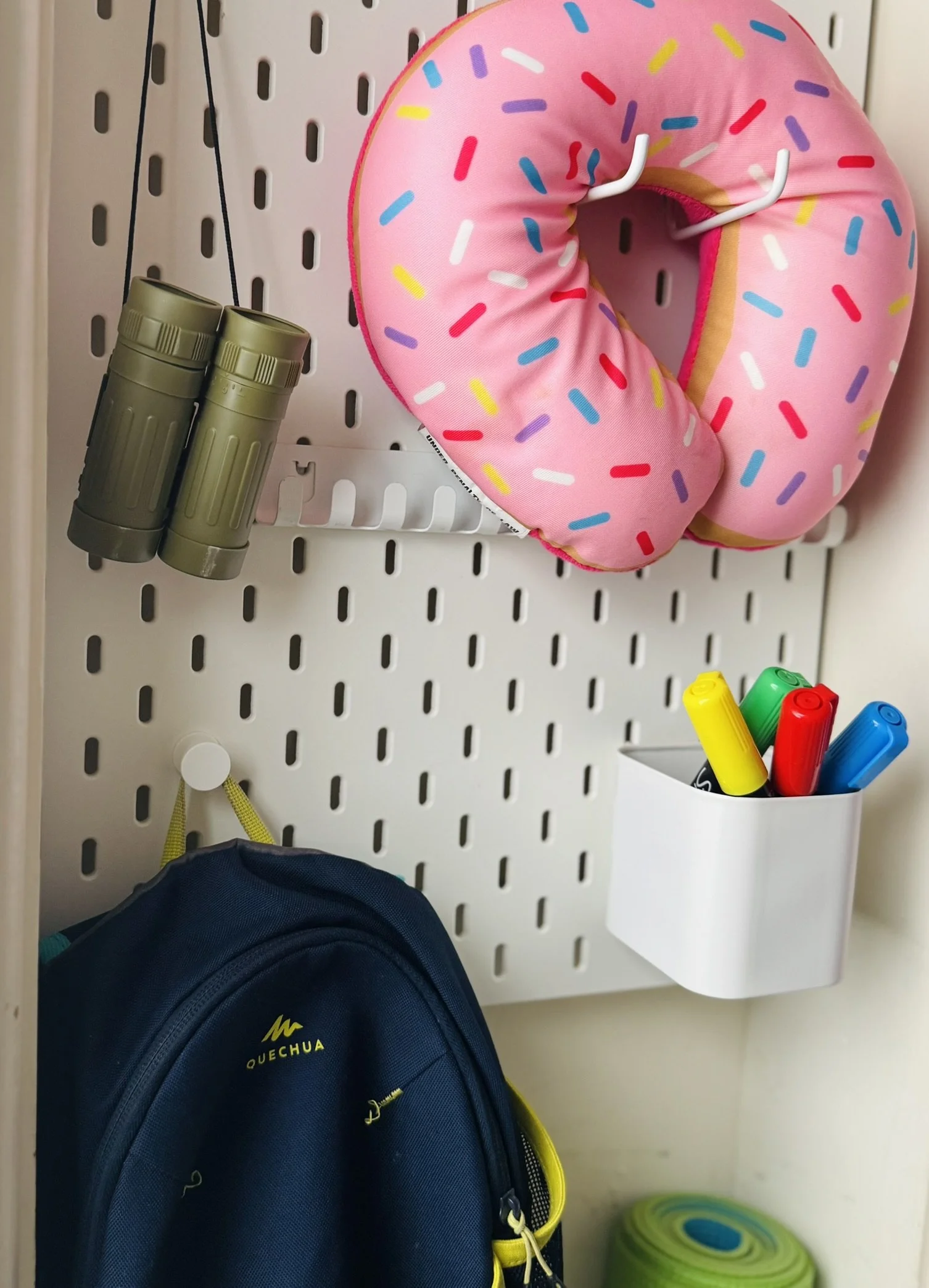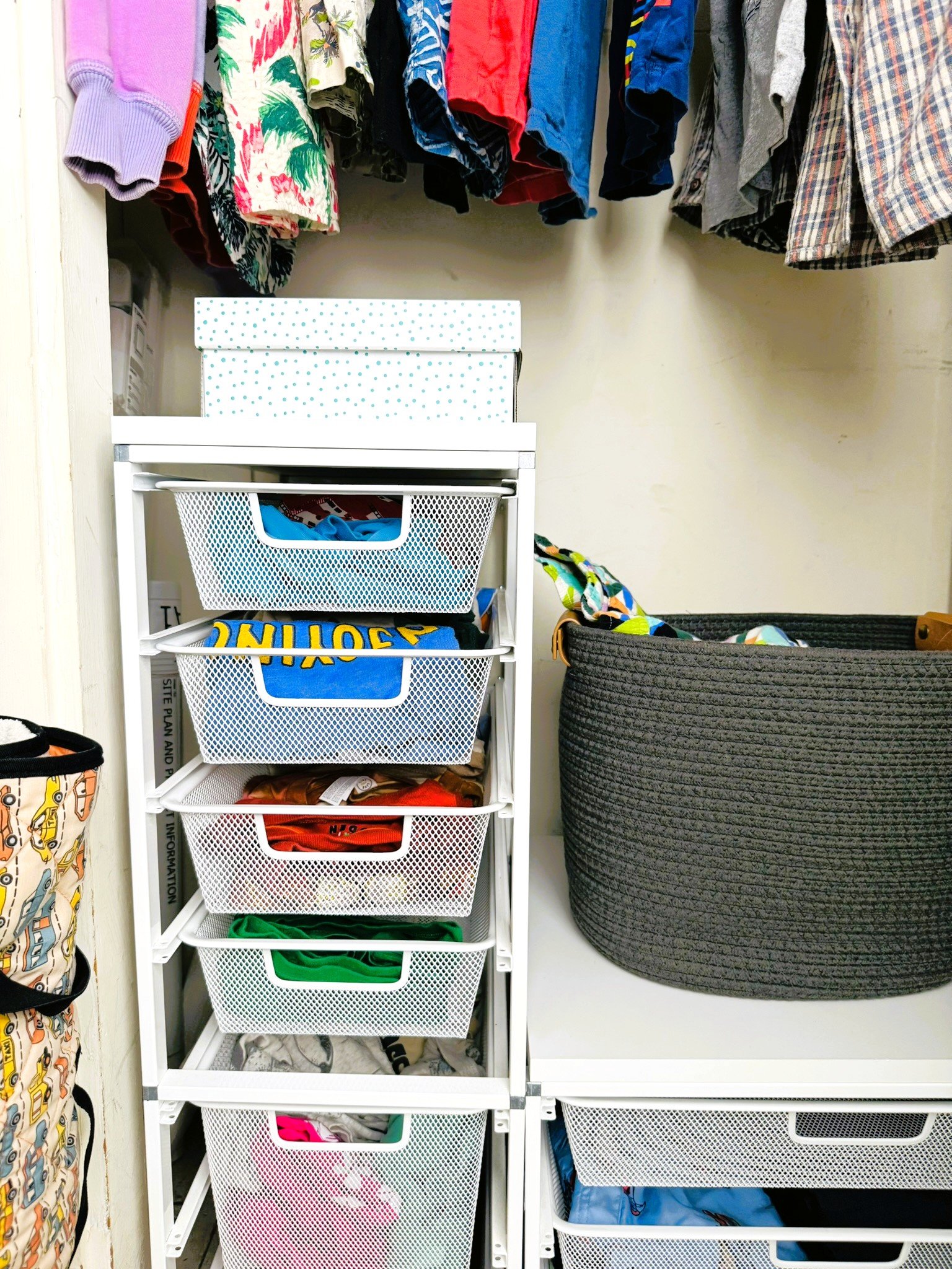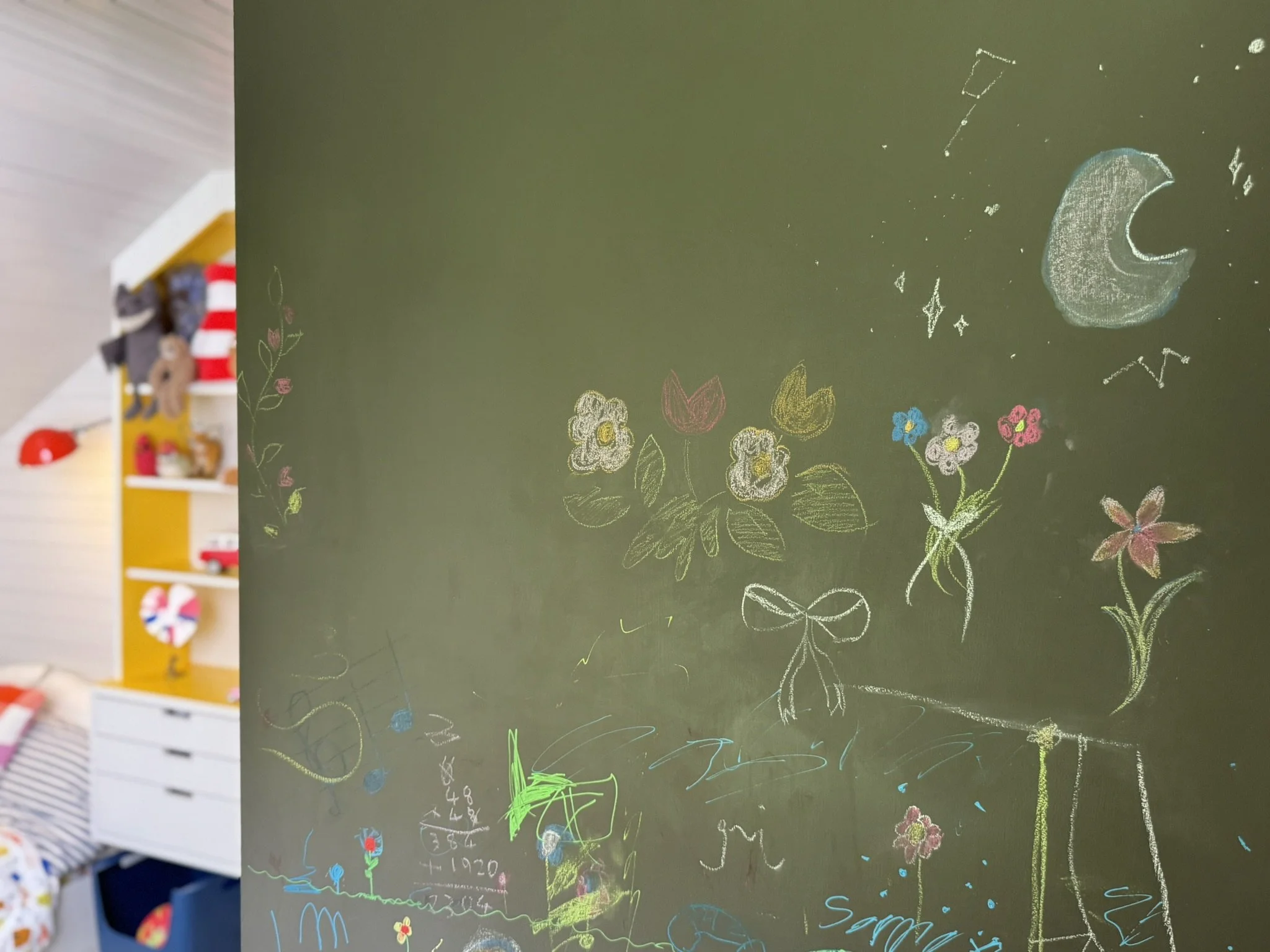 The chalk paint wall has become a favorite spot for visiting family to leave artful messages. The small existing closet was outfitted with off-the-shelf drawers and wall storage to create a place for the myriad objects of life.